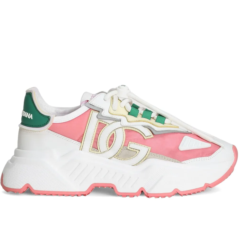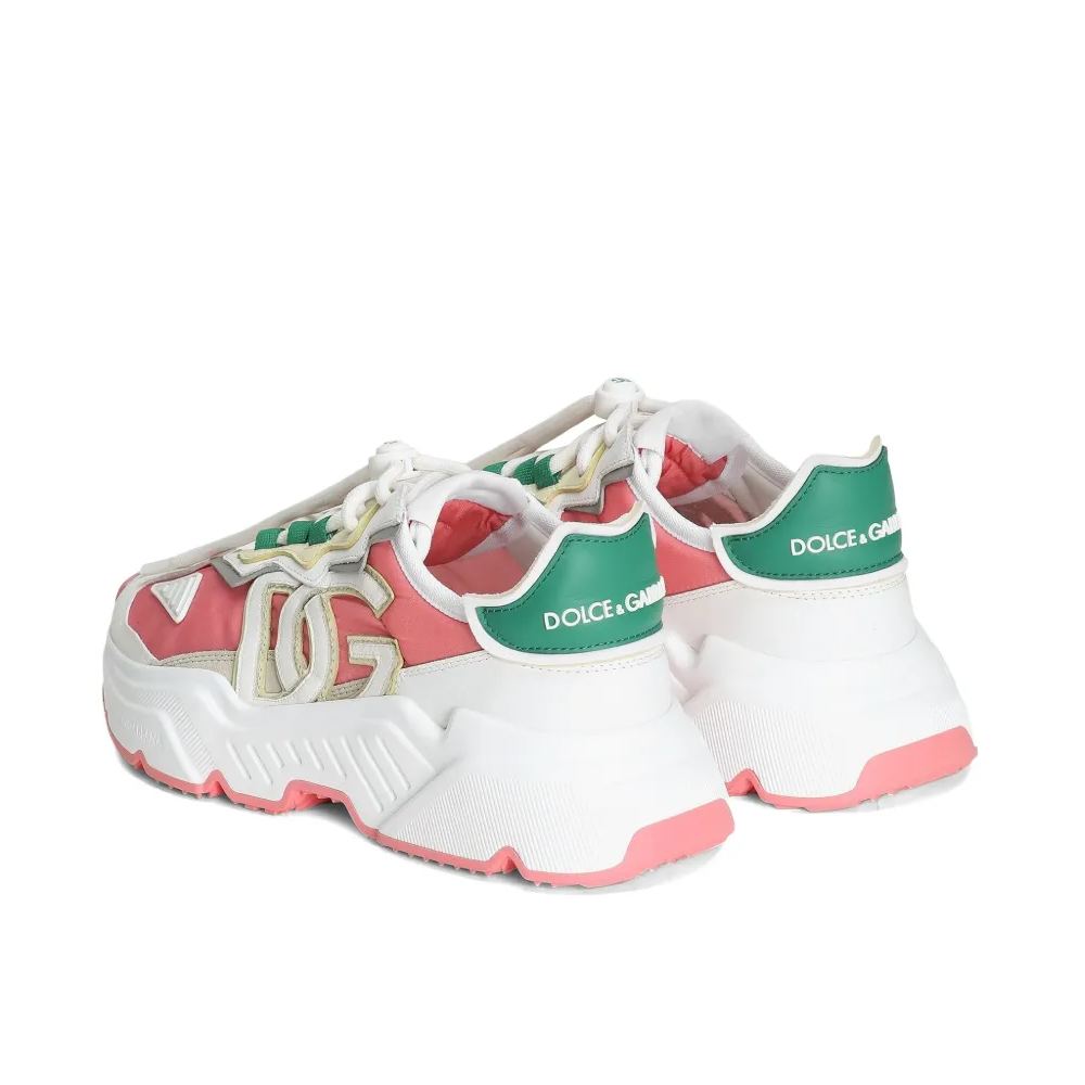 The Dolce & Gabbana Daymaster sneakers in white and pink deliver the perfect blend of sporty design and Italian elegance. Made from a combination of premium leather, mesh, and suede, the shoe offers breathability and durability. The white base is elevated by delicate pink details on the heel, sole, and logo areas, giving it a feminine yet bold edge. A thick, lightweight rubber sole provides superior grip and cushioning, while the leather interior ensures maximum comfort. Ideal for pairing with both casual and upscale outfits.